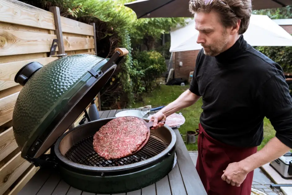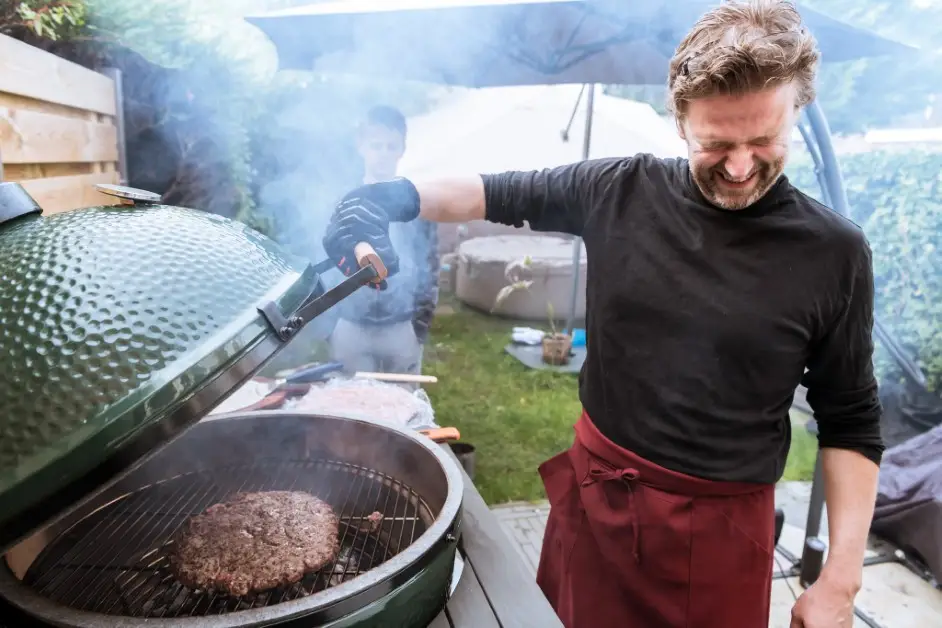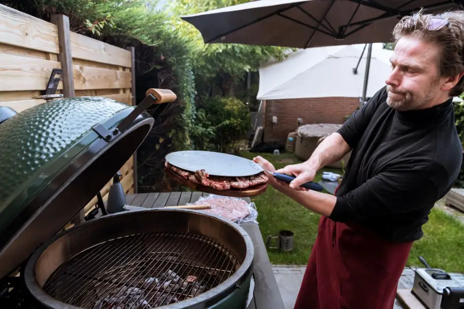 OMDRAAIEN: De pizzaschep is hiervoor onmisbaar. Wacht wel totdat de burger echt niet vastplakt. schuif de pizzaschep MET handschoenen onder de burger. Til het vlees eraf en doe er een bord, of ronde snijplank over. Belangrijk is dat deze uiteraard groter dan de burger zelf is. flip het allemaal om en schuif vervolgens weer op het rooster. (Het kan zijn dat dit lastig gaat ik heb de burger een duwtje moeten geven met mijn hand de tweede keer. ook de rookontwikkeling werd enorm. Wel spectaculair voor foto’s maar stond echt te janken.)