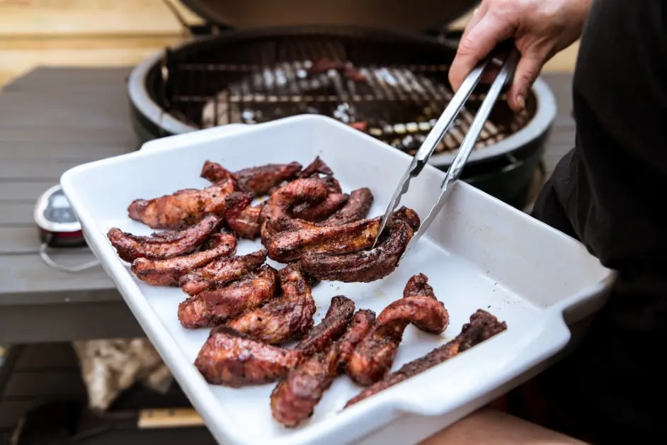 Ok we gaan de Iberico Ribfingers klaarmaken. Als je Kamado op 120C is en lekker rooks kan je de fingers op het rooster leggen. Ik vind het toch altijd prettig om de dunnere iets meer naar het midden te leggen dan de dikkere fingers. zo vlak bij de rand van de convegtor is het toch het heetst. Zo gaart alles een beetje gelijk.